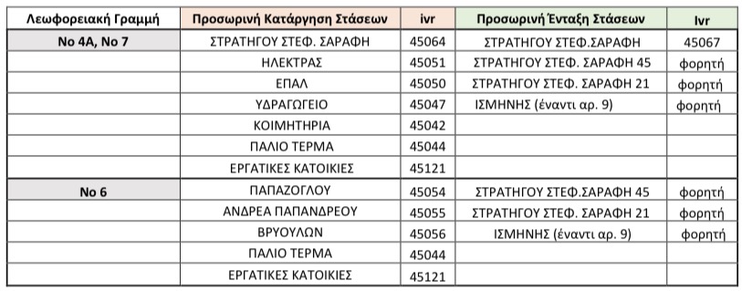 Για την καλύτερη εξυπηρέτηση του επιβατικού κοινού ιδρύονται προσωρινά στάσεις στις οδούς Στρατηγού Σαράφη 45, Στρατηγού Σαράφη 21 και Ισμήνης ενώ καταργούνται στάσεις στην οδό Στρατηγού Σαράφη, Ηλέκτρας, ΕΠΑΛ, Υδραγωγείο, Κοιμητήρια, Παλιό Τέρμα, Εργατικές κατοικίες και Παπάζογλου, Α. Παπανδρέου, Βρυούλων.